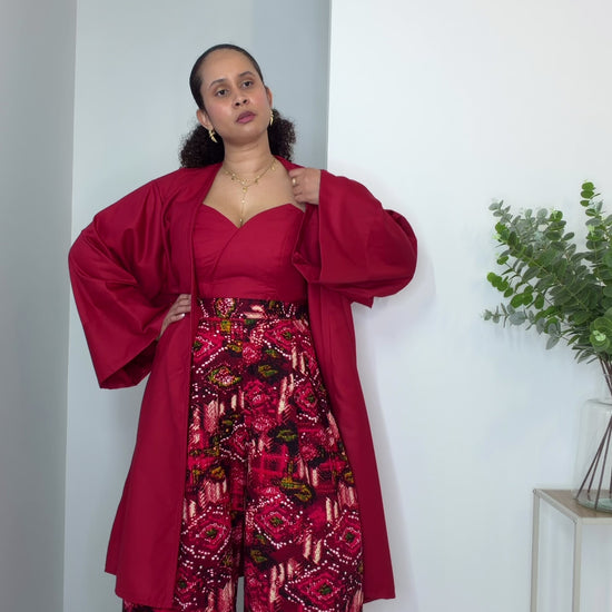 L'ensemble trois pièces "Sonaninéna" en rouge offre style et polyvalence. Le kimono fluide enveloppe élégamment votre silhouette, tandis que le bustier en tissu uni assure un maintien confortable et épuré. Le pantalon ample avec sa coupe généreuse privilégie l'aisance. Ces trois pièces se combinent facilement pour créer différents looks selon vos envies et occasions. Que vous les portiez ensemble ou séparément, cet ensemble vous permet d'exprimer votre personnalité avec confiance. Parfait pour celles qui cherchent une garde-robe versatile et stylée.