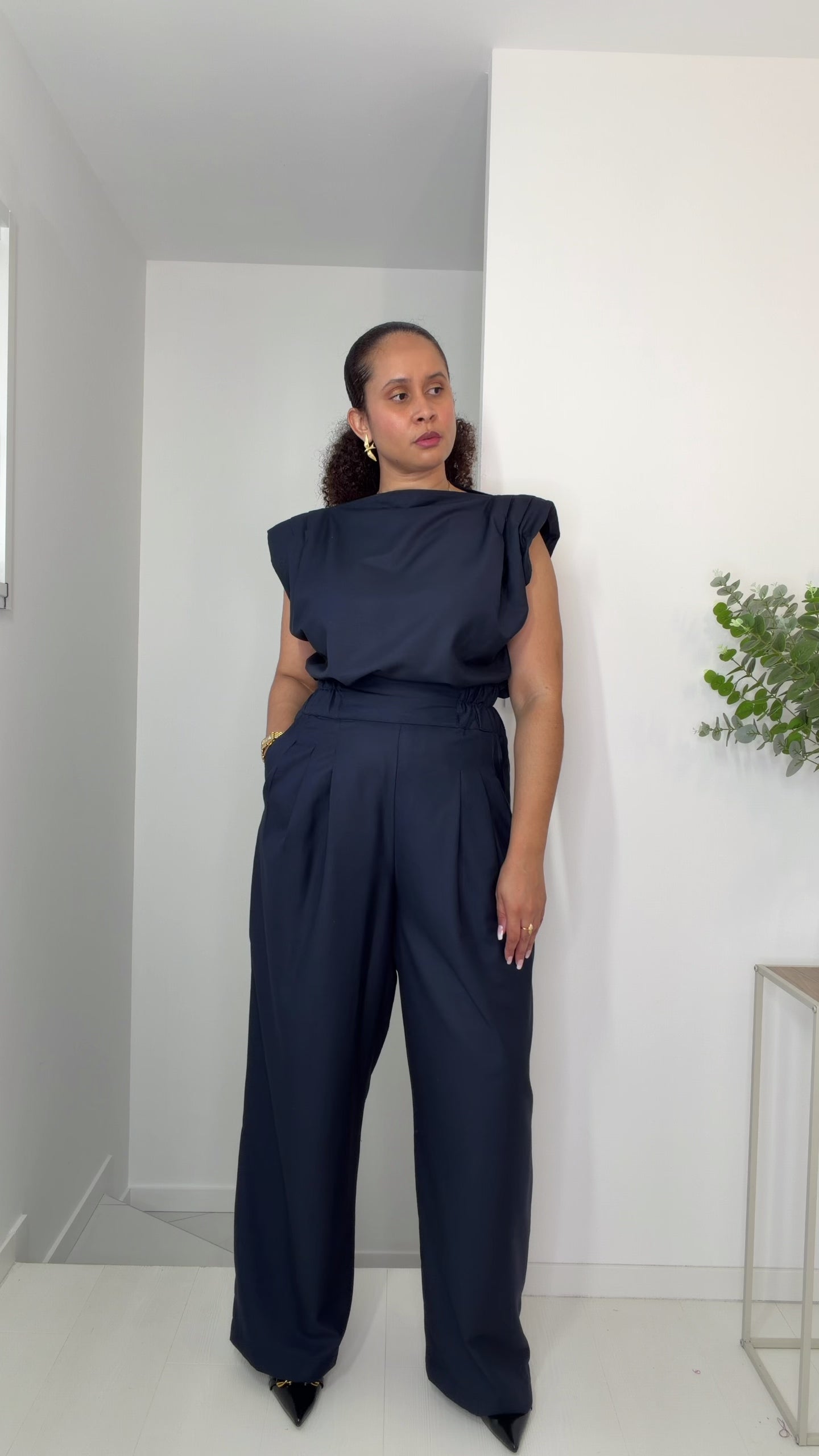 L'ensemble "Zonwlouloqui" en bleu nuit incarne la sophistication épurée. Le top aux épaulettes marquées structure la silhouette, créant des lignes nettes et affirmées. Le pantalon fluide cintré à la taille haute allonge la jambe tout en soulignant harmonieusement la morphologie. Cette coupe offre un maintien subtil et flatteuse pour tous les types de silhouettes. Un ensemble polyvalent, parfait pour les occasions professionnelles comme les sorties plus décontractées, qui affirme un style personnel raffiné et contemporain.