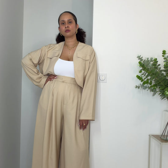 L'ensemble "Okponkpo" beige offre confort et liberté. La veste ample permet une silhouette décontractée tout en conservant une allure soignée, idéale pour les journées chargées. Le pantalon fluide large stretch à la taille garantit une aisance remarquable et une réelle élégance. Un ensemble polyvalent, du quotidien aux occasions plus formelles, incarnant l'équilibre entre détente et raffinement.