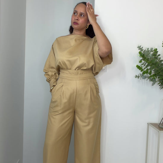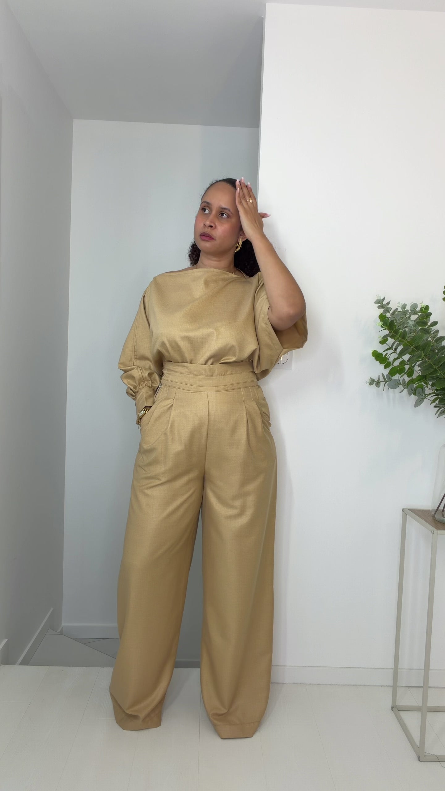 Le top asymétrique crée des lignes dynamiques qui subliment la silhouette avec originalité. Le pantalon fluide cintré à la taille épouse délicatement vos courbes tout en permettant une aisance de mouvement naturelle. L'association du top et du pantalon épuré compose un ensemble sophistiqué et moderne, parfait pour affirmer un style personnel distinctif. Idéal pour les occasions où vous souhaitez sortir de l'ordinaire sans renier l'élégance.